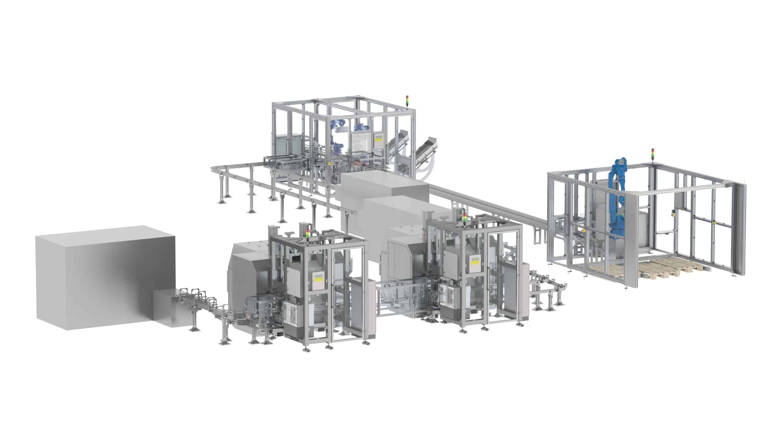 The packaging plant here depicts the primary and secondary packaging for organic bags, incl. the following palletizing. Coreless winded rolls are directly taken from two winding plants and placed in top load boxes that have been erected before. Robot-assisted gripper technology ensures that the rolls do not unwind during removal …