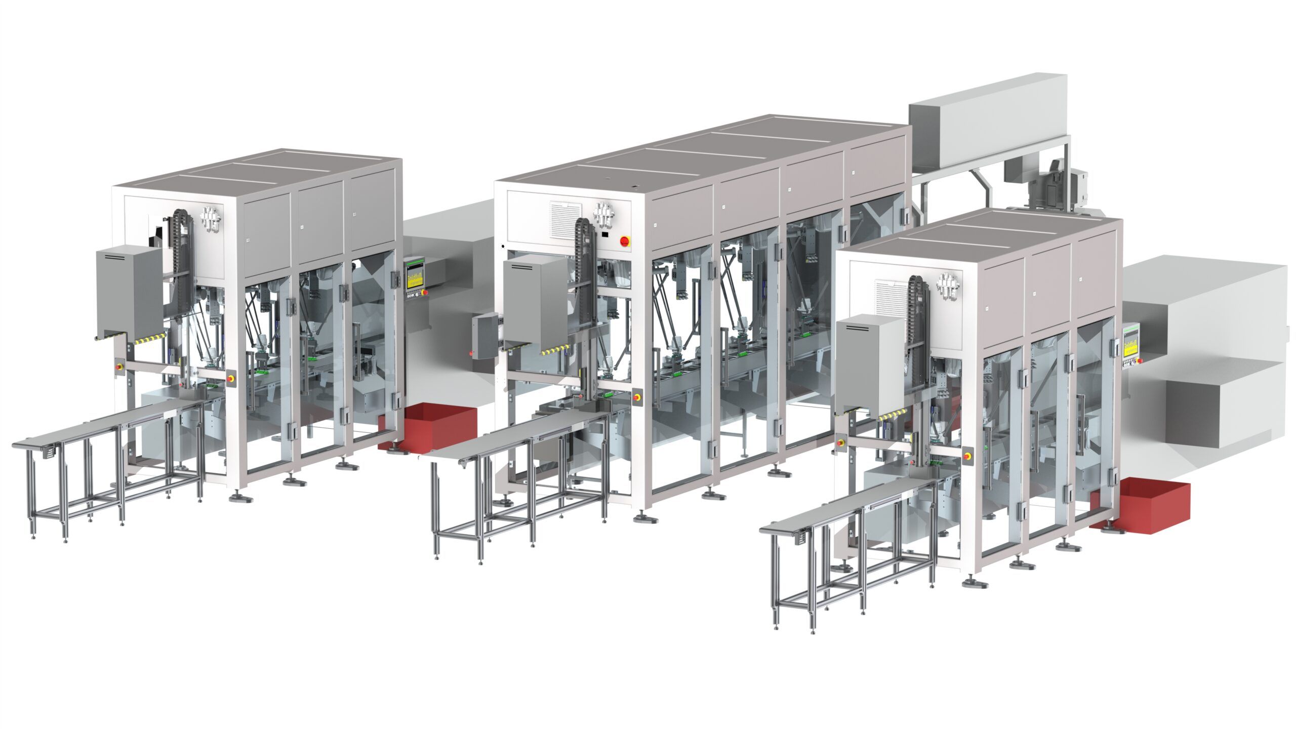 The packaging plant here depicts the secondary packaging of a beaker product, incl. an assortment with up to three sorts. Coming from a cooling tunnel, the main sort is transported inline to the packaging line. The sorts 2 and 3 are manually removed from boxes by means of an unloading device according to type …